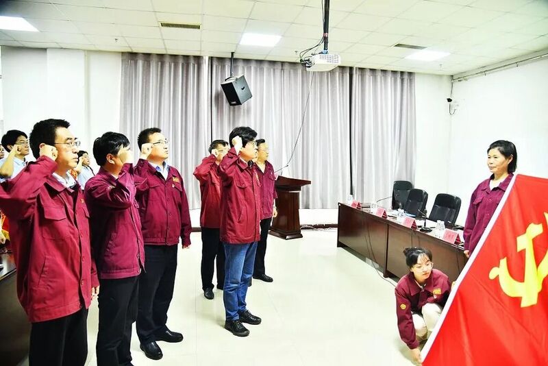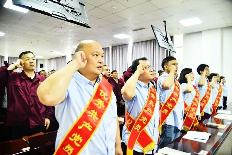 会议在庄严的国歌声中拉开序幕,党委书记、董事长李增伟带领全体党员面对鲜红的党旗,举起右拳,庄严宣誓。