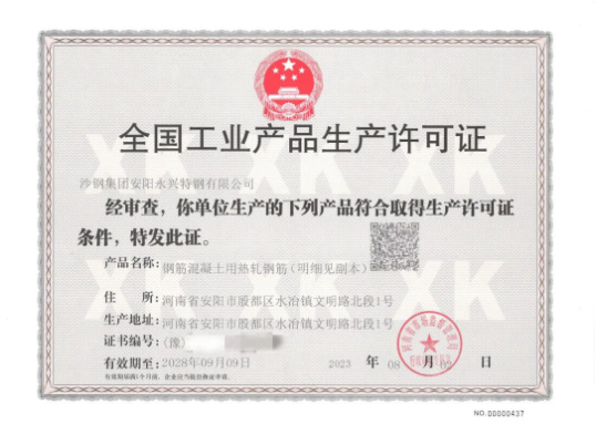 近日,喜讯传来,沙钢永兴特钢公司HRB400、HRB400E、HRB500、HRB500E、HRB600热轧钢筋用钢坯和热轧带肋钢筋的全国工业产品生产许可证成功换发。