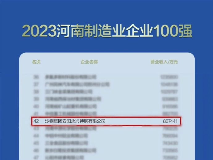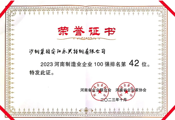 10月27日上午,由河南省企业联合会、河南省企业家协会主办的“2023河南企业100强高峰会”在开封市召开。会议公布了“2023河南企业100强”名单,沙钢集团安阳永兴特钢有限公司位列第70位,连续7年上榜“河南企业100强;在同时发布的“2023河南制造业企业100强”榜单中,沙钢永兴公司位列第42位。