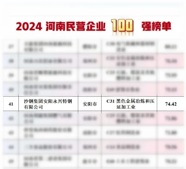 风劲帆满图新志,砥砺奋进正当时。10月14日,河南省工商联发布2024河南民营企业100强榜单,沙钢集团安阳永兴特钢有限公司以74.42亿元的年营收总额位列第41位,在上榜的7家安阳市企业中排名第3。