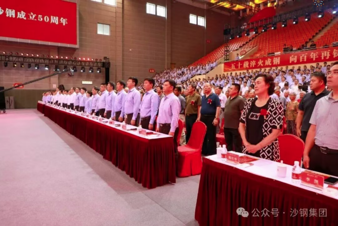 张家港市领导韩卫、顾晓东、邵军民、王亚方、赵建明、李炳龙、蒋鹏、万资平、赵瑜,以及市各有关部门和单位主要负责人,冶金园(锦丰镇)领导班子成员、相关局室主要负责人出席大会。沙钢集团领导沈彬、龚盛、陈少慧、何春生、季永新、陈晓东、施一新、马毅,以及本部全体公司领导,老同志代表、干部职工代表、相关嘉宾欢聚一堂,共庆沙钢五十华诞,展望打造“百年沙钢”的宏图新篇。集团各成员企业视频参会。