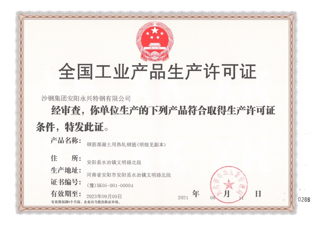 6月11日,从河南省市场监督管理局传来好消息,公司热轧带肋钢筋许可证扩证工作顺利通过审核,成功取得600MPa级高强螺纹钢HRB600规格12mm-32mm热轧带肋钢筋生产许可证,标志着我公司在原有400MPa、500MPa级螺纹钢生产基础上,产品升级至600MPa级高强螺纹钢(HRB600高强螺纹钢是现行国家标准最高等级的热轧带肋钢筋),成为河南省首家获此级别螺纹钢的生产企业,填补了河南省高强螺纹钢生产领域的空白,为公司转型升级高质量发展提供了有利支撑。