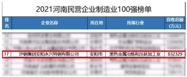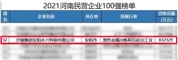 12月8日,河南省政府新闻办举行新闻发布会,公布2021河南民营企业100强榜单,沙钢集团安阳永兴特钢有限公司以83.23亿元的年营收总额位列第32位(安阳市第2位),在同时公布的2021河南民营企业制造业100强和2021河南民营企业社会责任100强榜单中,沙钢永兴公司分别位列第17位(安阳市第2位)和第27位(安阳市第1位)。