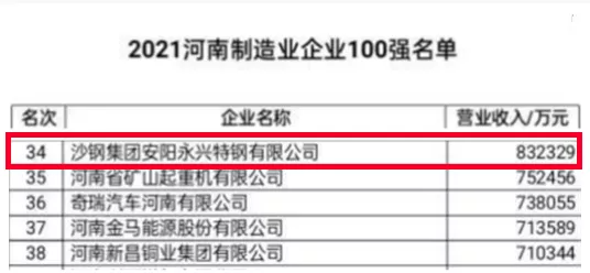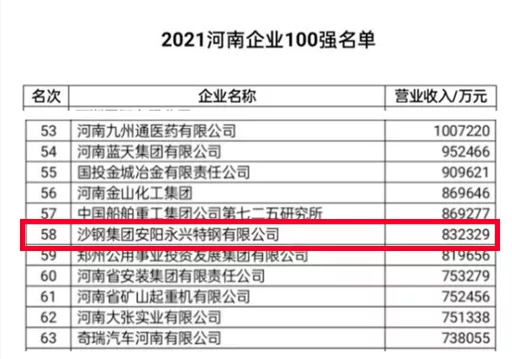 theCompanyNews祝贺!沙钢永兴特钢公司入围“2021年河南百强企业”