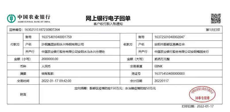 同心战“疫",共克时艰。在安阳市异常严峻的疫情形势下,2022年1月17日,沙钢永兴特钢公司通过安阳市殷都区慈善总会捐赠200万人民币,将专项用于抗击新冠病毒肺炎疫情防控工作,助力安阳市打赢疫情防控阻击战。